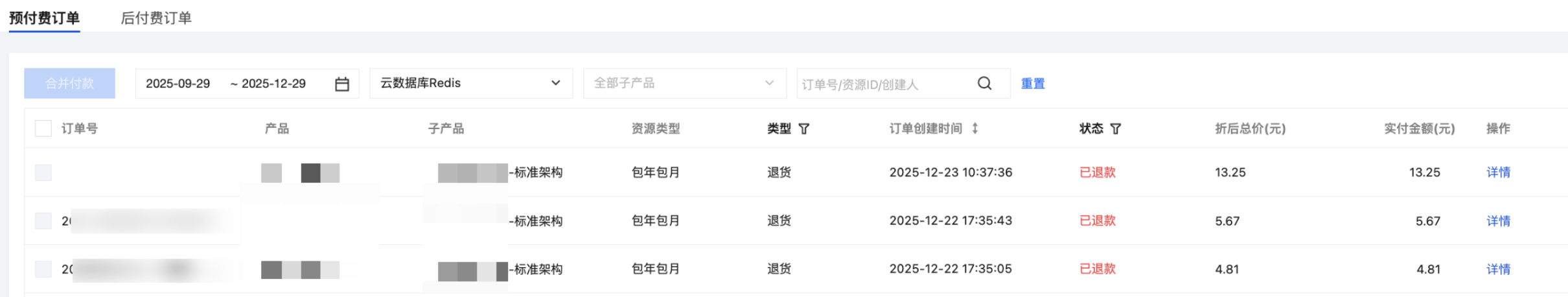 单击查看退款进度,进入费用中心的订单管理页面,在预付费订单页签可随时跟踪退款进度。如下图所示,在操作列,单击详情,可查看该订单的详细信息。单击右侧导航栏的收支明细,可查看退款到账。