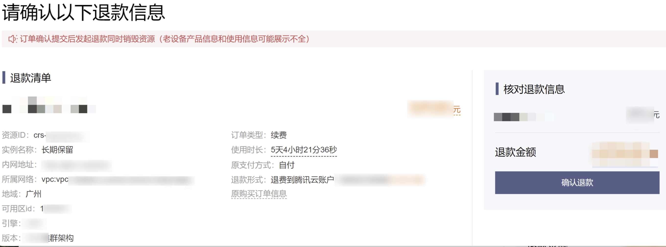 5. 在请确认以下退款信息页面,确认退款清单,包括:实例信息、网络信息、地域与可用区、退款形式等,并核对退款金额,单击确认退款。