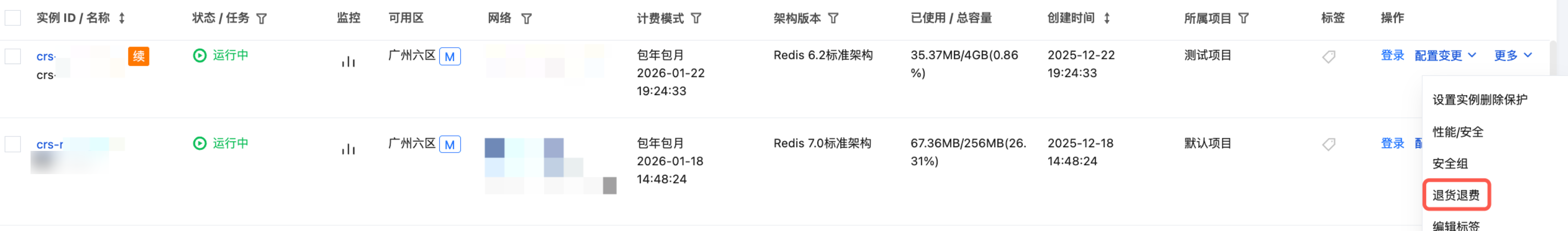 3. 在实例列表中,选择需退还的包年包月实例,在操作列,选择更多 > 退货退费。