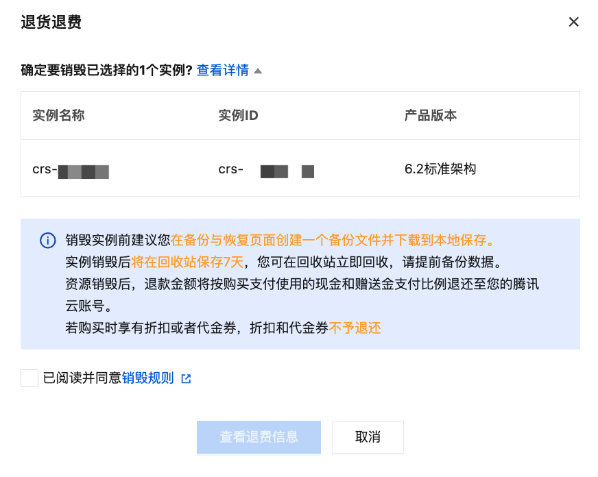 4. 在退货退费的小窗口,单击查看详情,确认退还的实例信息,并了解销毁实例的注意事项。单击销毁规则,了解退费金额的计算方式,勾选已阅读并同意,单击查看退费信息。