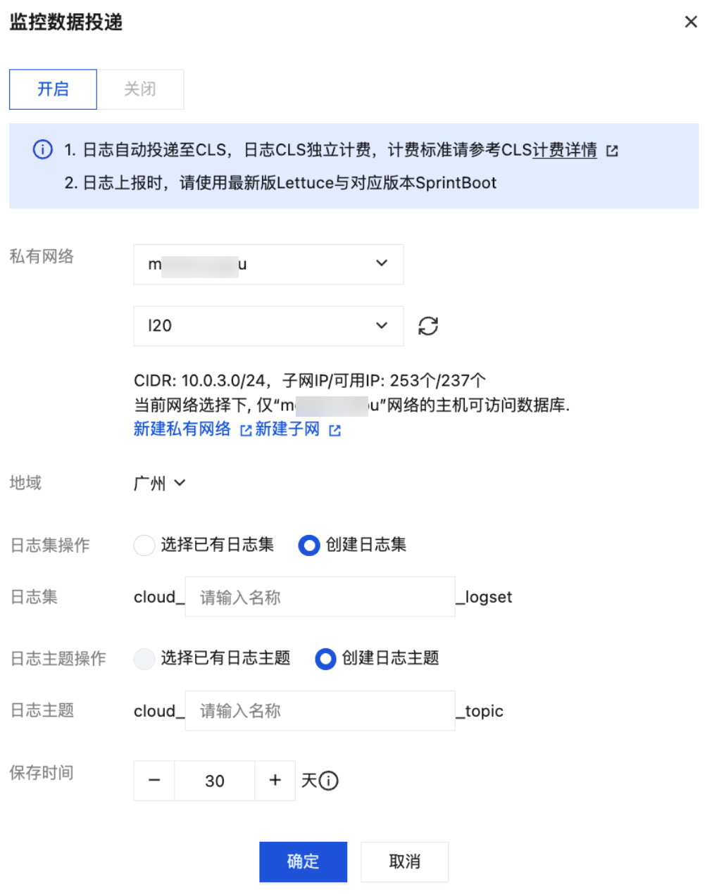 日志集 | 日志集操作选择为选择已有日志集:请在下拉列表中筛选目标日志集,可进行搜索,选择合适的日志集。 日志集操作选择为创建日志集:请在输入框根据命名要求编辑日志集名称,创建新的日志集。命名格式为 cloud_自定义名_logset,其中自定义部分支持任意字符,无长度限制。 | cloud_redis_monitor_logset |