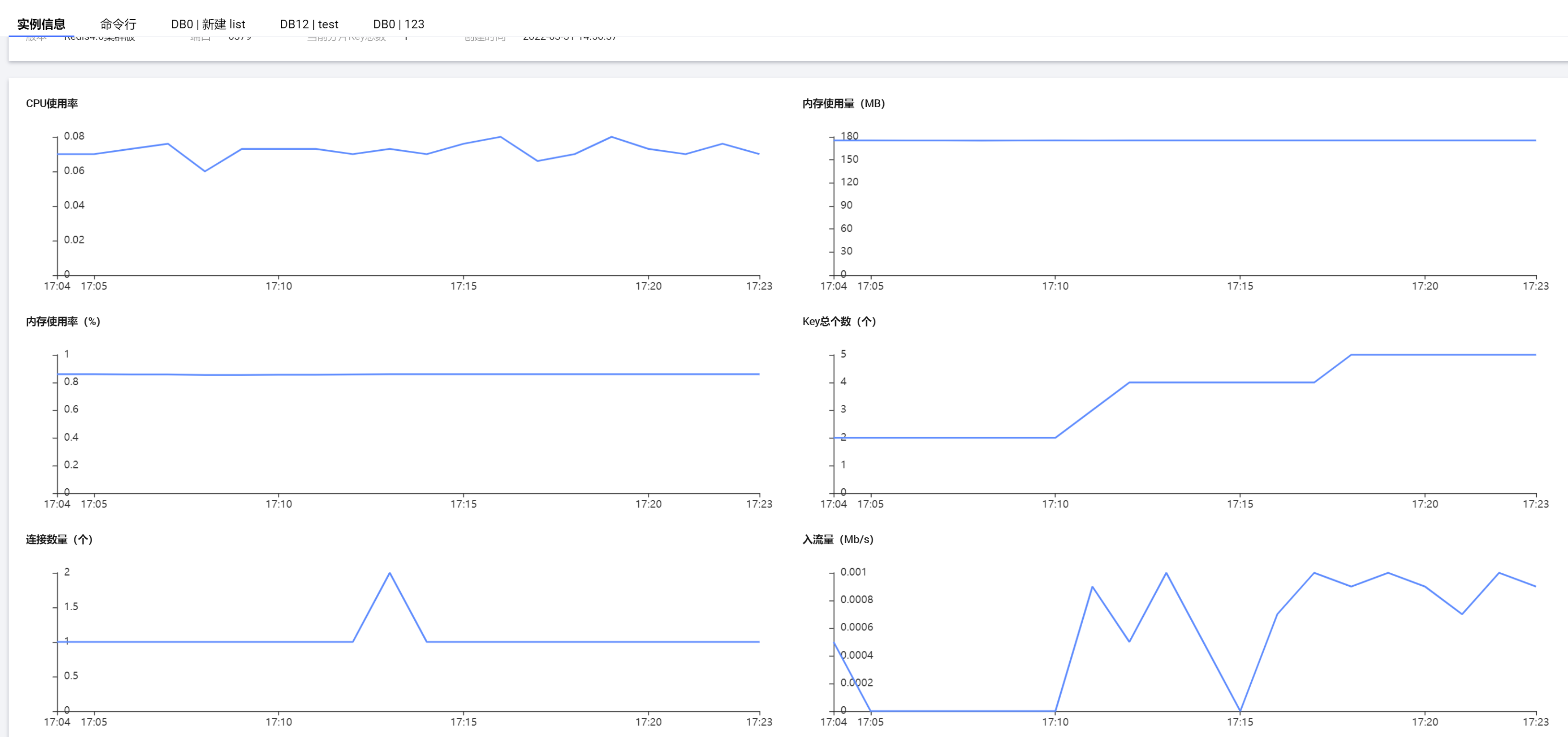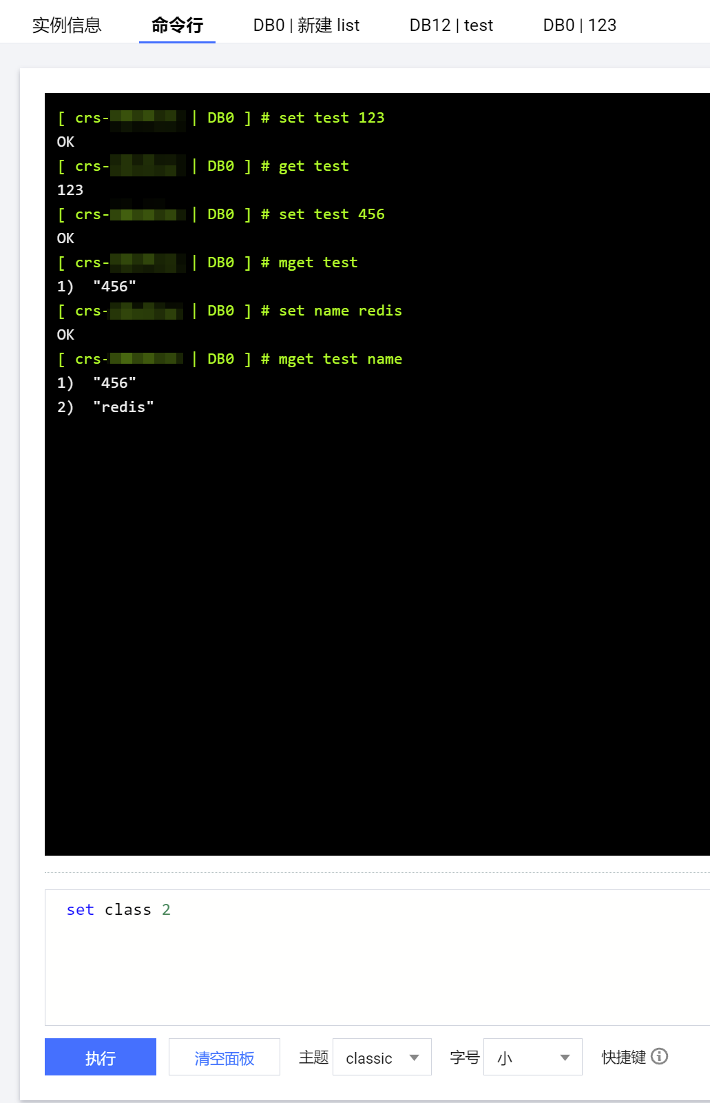 7. 单击命令行页签,在下方的输入框输入并执行 Redis 命令,使用示例如下图所示。