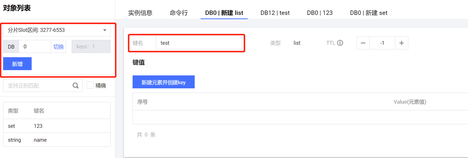 8. 如果您对 Redis 的命令参数不是很熟悉,可以在页面左侧的对象列表区域,选择键值存放的 Slot 区间以及 DB,单击新建,并选择键的数据类型,单击确定,在键名输入框编辑键名称,单击新建元素并创建key,在新建元素对话框,输入键对应的键值,单击确定。系统将根据设置的键与键值的信息运行命令。