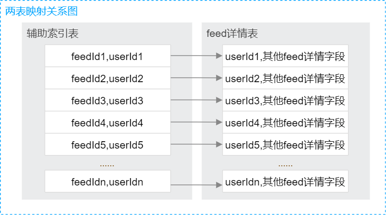 这时候就可以引入 FeedId_userId_relationship 辅助表采用 feedId 作为片键,该表和 feed_info 详情表的隐射关系如下图所示。