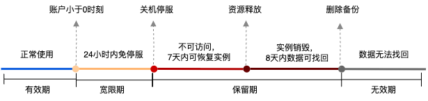 宽限期 | 欠费24小时之内 | 云数据库资源延期免停服,可正常访问。 正常计费:账户余额小于0,24小时之内,云数据库可正常访问,且继续扣费。 欠费第24小时结束时刻,如未成功充值至余额大于等于0,云数据库资源被关机停服,在回收站中保留。 说明: 腾讯云欠费时刻,发送欠费通知,包含:欠费金额、账户下所有按量计费资源的预计停服时间以及最终销毁时间。 |