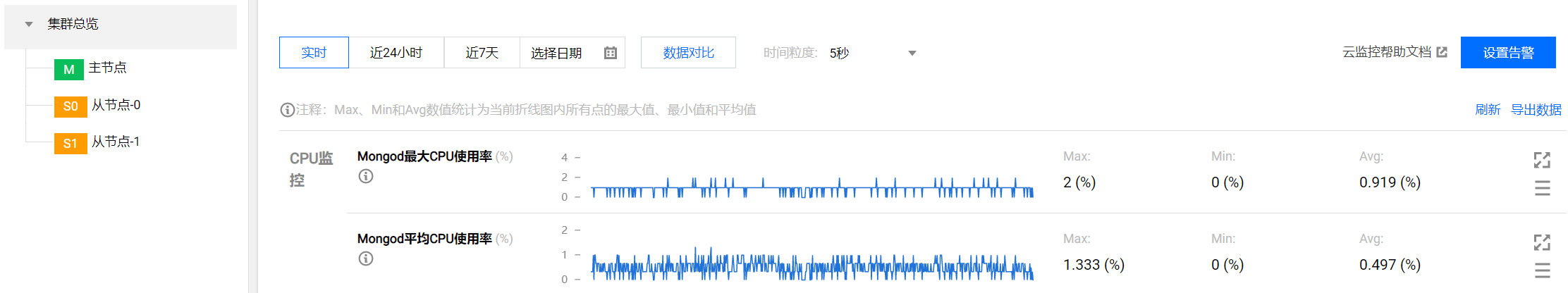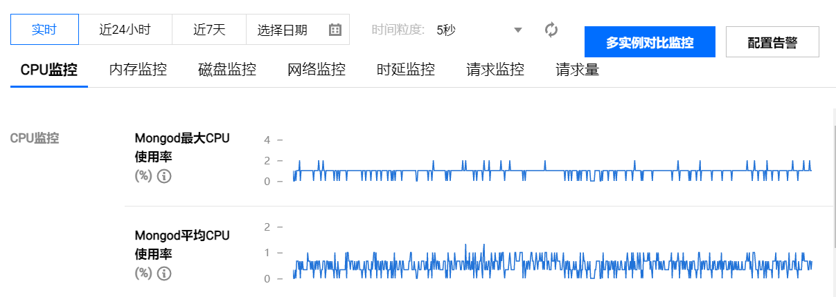 在实例监控页面右侧上方,单击设置告警,进入腾讯云可观测平台的 新建告警策略 页面。设置策略类型为云数据库 / MongoDB / 实例,选择告警对象,并设置监控指标的触发条件,配置告警通知方式, 帮助您第一时间了解指标发生的异常,及时预防风险、避免故障发生。具体操作,请参见 配置告警。 数据对比