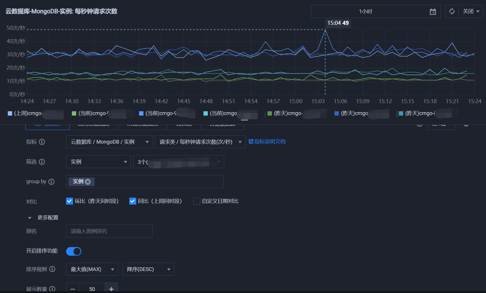 在实例监控页面右侧上方,您可以单击数据对比,设置对比监控数据的时间范围,默认获取一小时内的数据,以不同颜色对比显示昨天与今天监控指标在该时间区间的变化曲线。