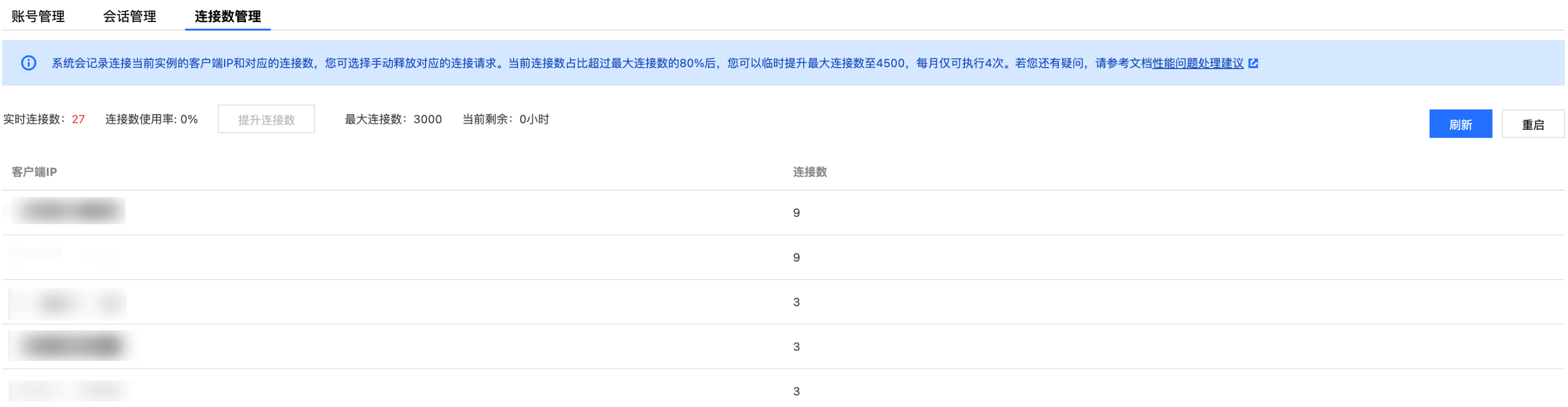 1 | 连接监控与手动干预 | 系统会记录所有连接至实例的客户端 IP 及其连接数。如发现异常来源或需紧急释放资源,您可手动断开指定连接。 |