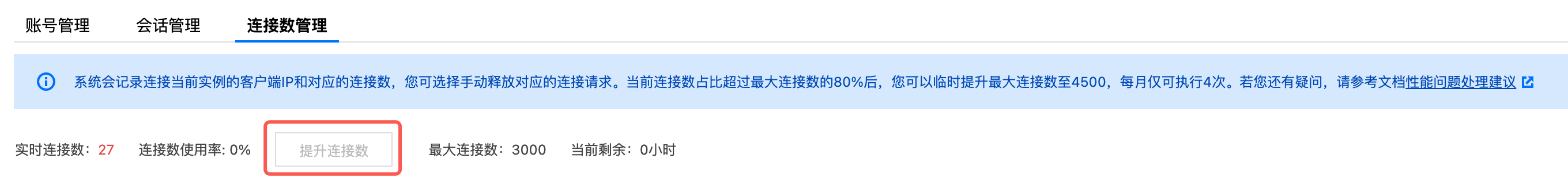 1. 在连接数管理页面,单击提升连接数。