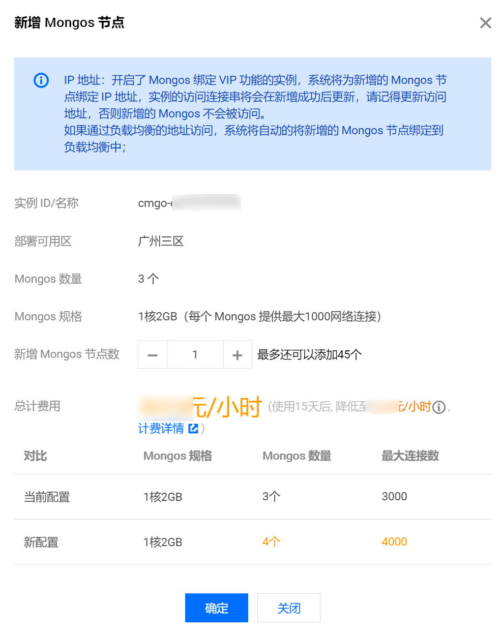 新增 Mongos 节点数 | 请选择需增加的 Mongos 数量,Mongos 节点最大总数为48。 |