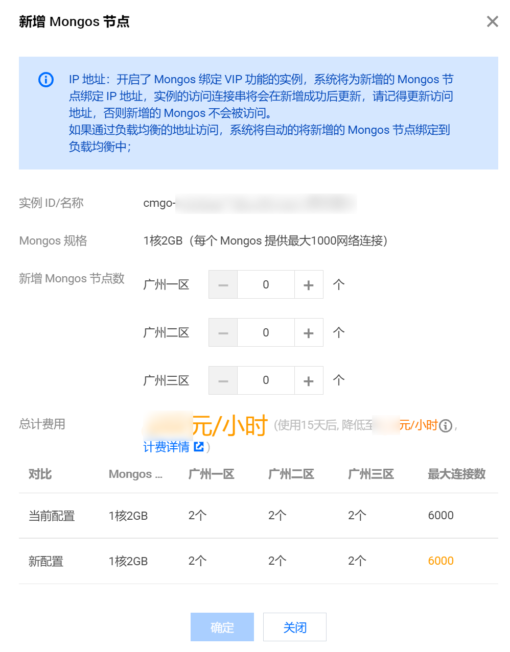 对比 | 可对比 Mongos 变更前后的配置规格、可用区的节点数量及其最连接数,请评估新规格是否满足要求。 |