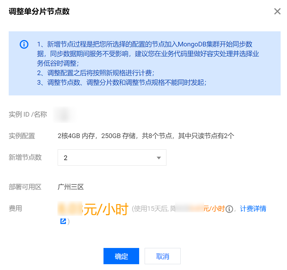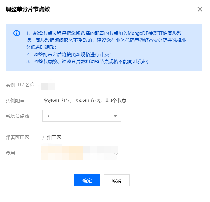 7. 在调整单分片节点数对话框,了解调整节点数的注意事项,根据如下表格的参数解释,确认并配置参数。