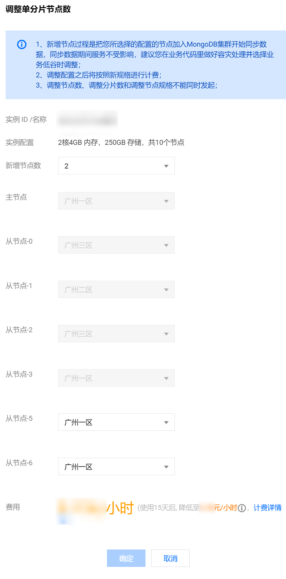 实例配置 | 请了解实例当前的配置规格,包括 CPU 核数、内存、磁盘容量、节点数量。节点数量包含主从节点的总节点数。请根据当前配置评估需新增的节点数。 |