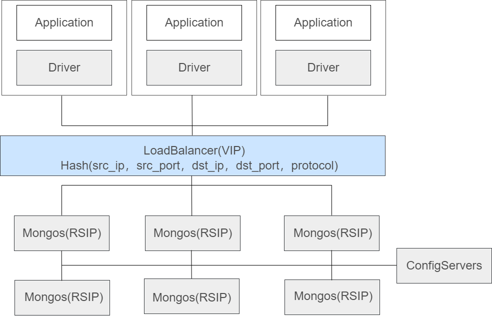 用户程序连接到一个负载均衡服务(VIP),通过一个 VIP 来屏蔽后端的多个 RSIP( Real Server IP )。云数据库 MongoDB 负载均衡服务通过源 IP、源端口、目标 IP、目标端口、通信协议5元组 Hash 策略,将不同请求源 IP 路由于不同的 Mongos 节点。如果后台出现 RSIP 变更,会有自动化的流程变更 VIP 和 RSIP 的映射关系,对用户无感知,接入简单。