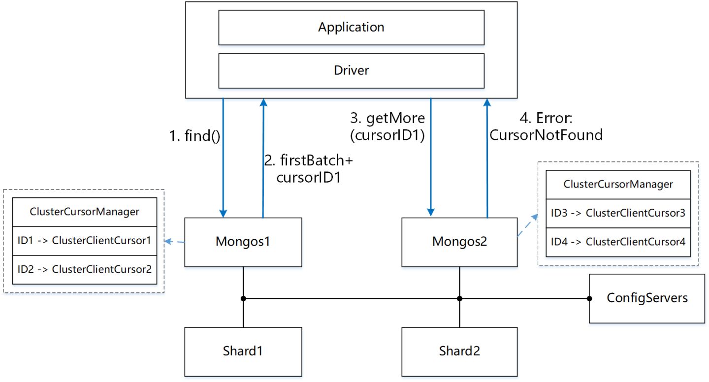 每个 Mongos 节点在内存中维护了一个全局的 ClusterCursorManager,通过 HashMap 维护了 cursorID 和 ClusterClientCusor 的映射关系。其中,cursorID 是一个 int64 的随机数,ClusterClientCursor 则维护了请求的执行计划、当前状态等信息。 因此必须要保证 find 及其相关联的 getMore 请求发往同一个 Mongos 节点。而如果 getMore 请求发给了其他的 Mongos 节点,会因为找不到 Cursor 返回 CursorNotFound 错误,如下图所示。