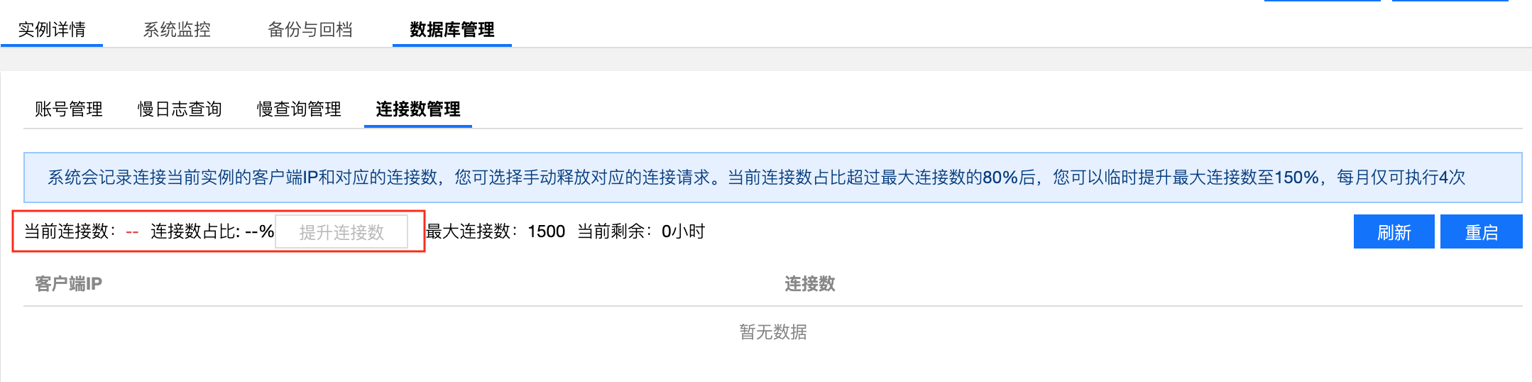 若提升连接数至150%还不能解决您的问题,请联系售后或 提交工单 处理。 方式二:重启实例