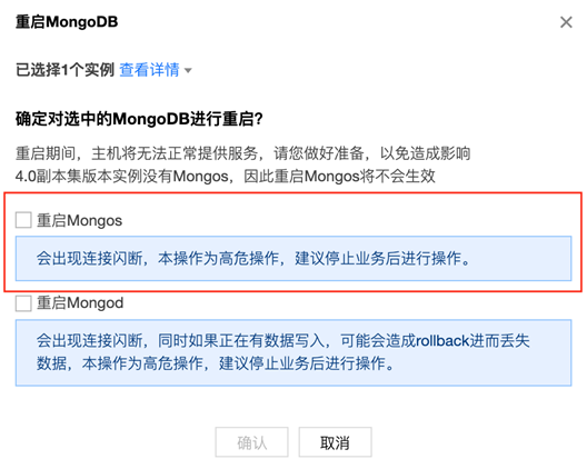重启 Mongod 为高危操作,会出现连接闪断,如果同时有数据正写入,可能会造成 rollback 进而丢失数据,默认不开放,如需开放请联系售后或 提交工单。 方式三:优化业务侧服务