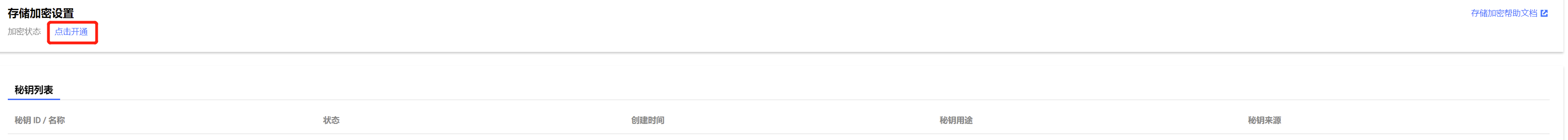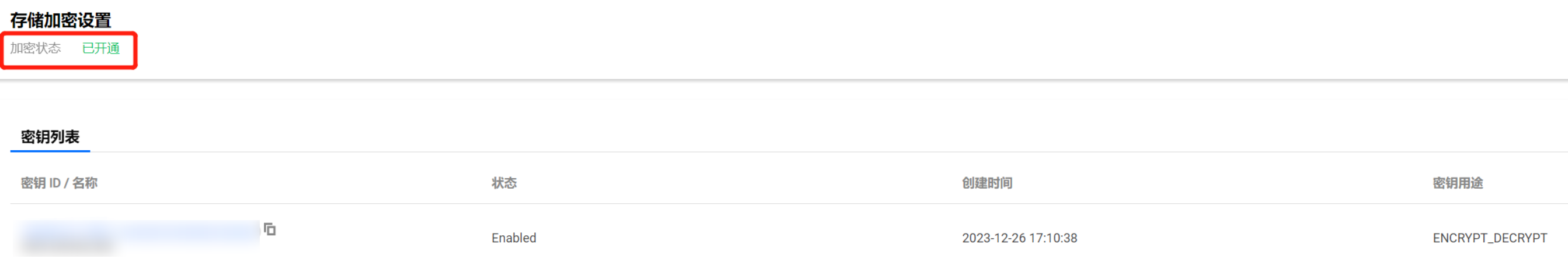 9. 切换到存储加密页面,可看到加密状态更新为已开通,并在密钥列表,可看到已创建的密钥。