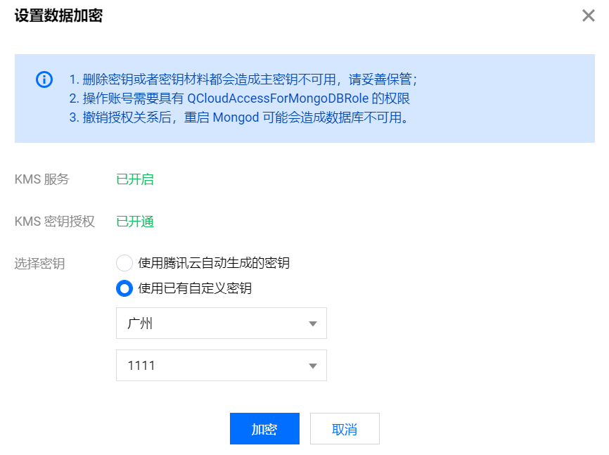操作账号需具有 MongoDB_QCSLinkedRoleInKMS角色权限。该角色及关联策略是 MongoDB 授予 KMS 创建密钥&管理密钥的权限。 如无权限,可在开通数据加密过程中根据引导进行授权。