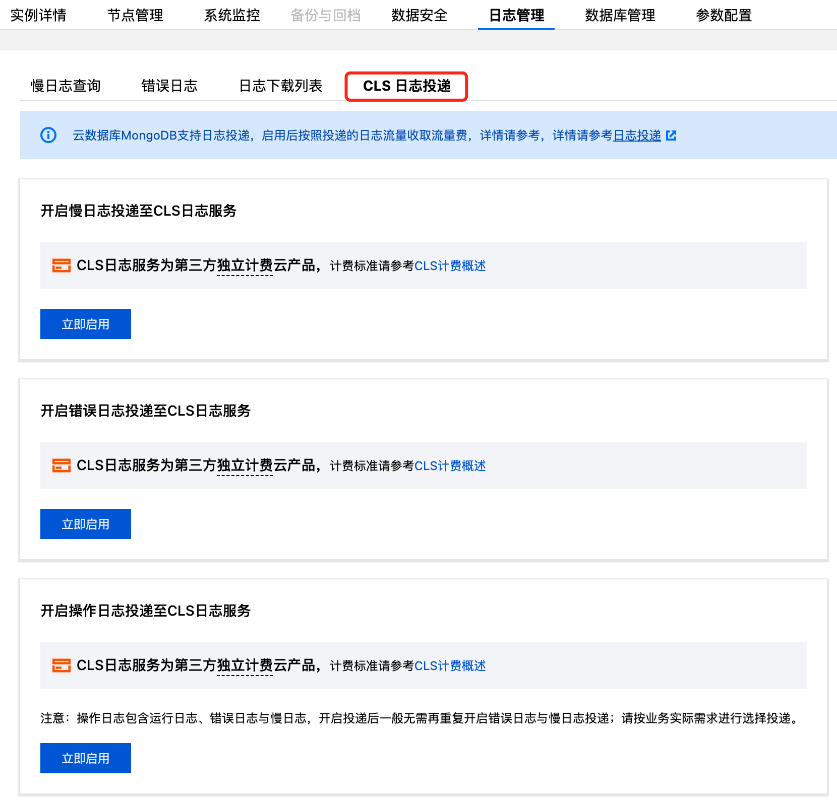 7. MongoDB 日志管理会自动识别是否开通 CLS 日志服务与是否授权服务角色,请根据页面提示信息开通或授权。慢日志、错误日志、操作日志可按需分别操作。以慢日志为例,单击立即启用,开启日志投递小窗口,选择日志投递的主题与日志集