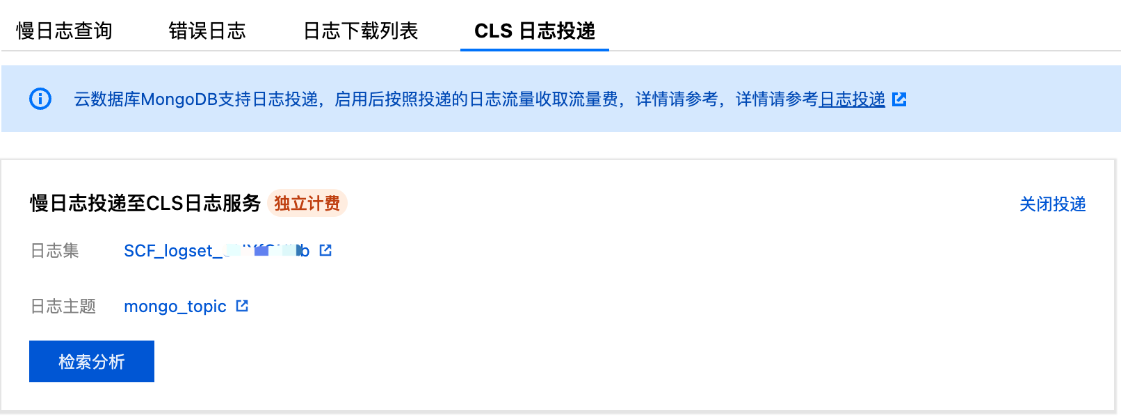 云数据库 MongoDB 启用日志投递,CLS 日志服务为第三方独立计费云产品,按照投递日志流量收取流量费,支持按量计费(后付费)资源包(预付费)两种方式,具体计费标准,请参见 CLS 计费概述