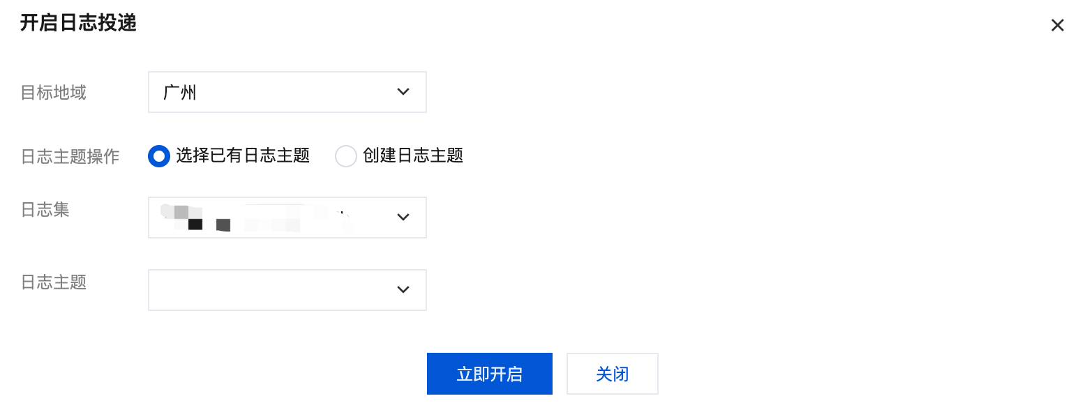 选择已有日志集:在下方日志集的下拉列表中选择已在 日志服务(Cloud Log Service,CLS)控制台 创建的日志集,并在日志主题下拉列表选择对应的日志主题。