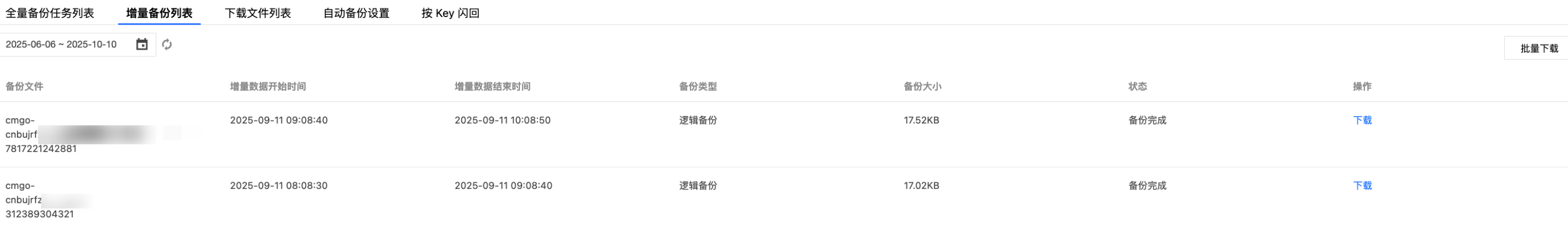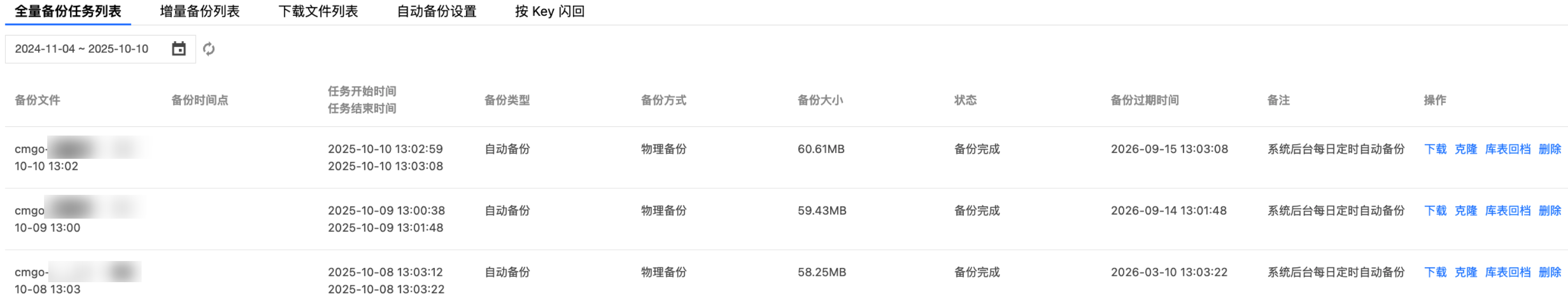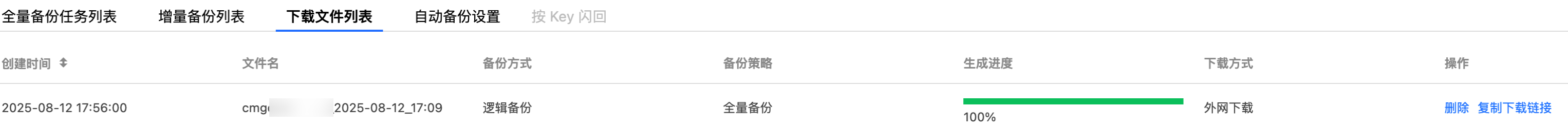 备份文件管理视图 | 备份文件列表集中展示所有文件的生成记录与下载进度,并可直接对文件进行下载或删除。 |