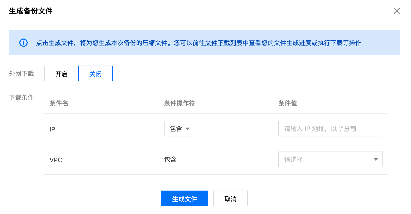 控制下载权限 | 支持通过 IP 地址与 VPC 网络,配置备份文件的下载访问权限,有效防止未授权访问,保障数据安全。 |