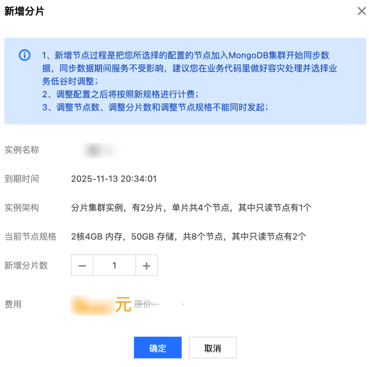 费用信息 | 费用 | 0.92美元/小时 | 按量计费:显示实例增加分片后每小时的计费单价。 包年包月:显示升级至新规格您需要支付的差价。 |