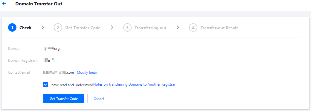 域名转出之前请确认是否已关闭禁止转移锁,若已开启,则无法转出,您需要先关闭禁止转移锁再进行域名转出。具体操作请参考 开启域名安全保护。 4. 在域名转出页面,核对邮箱,阅读并勾选 “我已阅读和理解《域名转移注册商(转出)注意事项》”,并单击获取转移码。如下图所示: