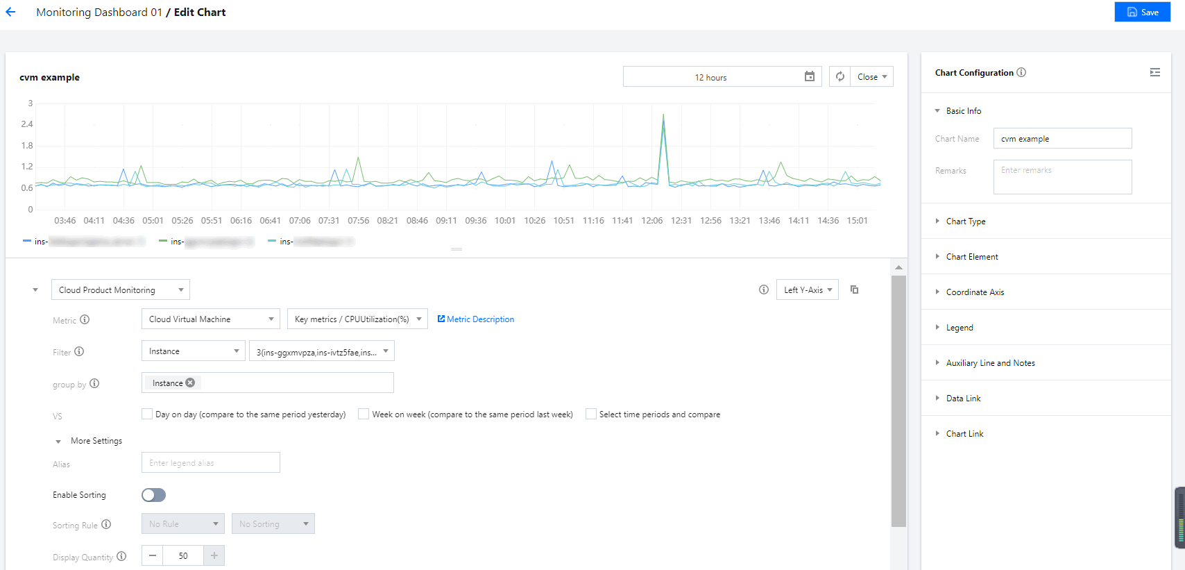 2. 在图表下方编辑指标信息和图表右侧定义图表名,编辑完后单击右上角的保存即可。详情请参见新建图表相关文档 步骤1:新建指标。