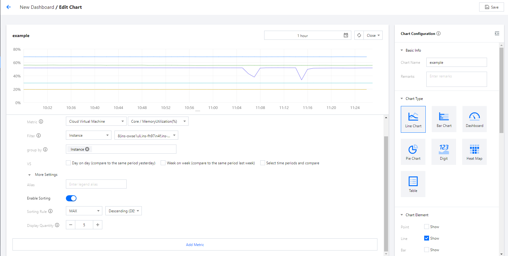 开启排序功能:图表所绑定的实例将按排序规则和展示数量进行排序,用于实现大批量监控机器高低负载功能。