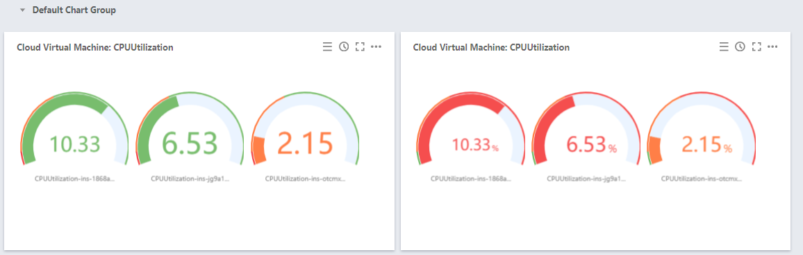 阈值:定义达到阈值颜色,格式:数值,数值。例如填写 50,80,数值 < 50时展示为绿色,50 <= 数值 < 80时展示橙色,数值 >=80 时展示红色。