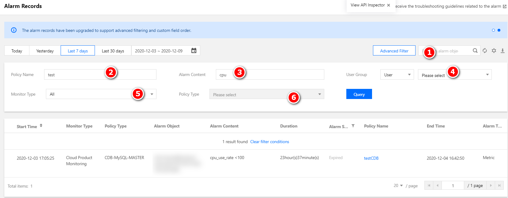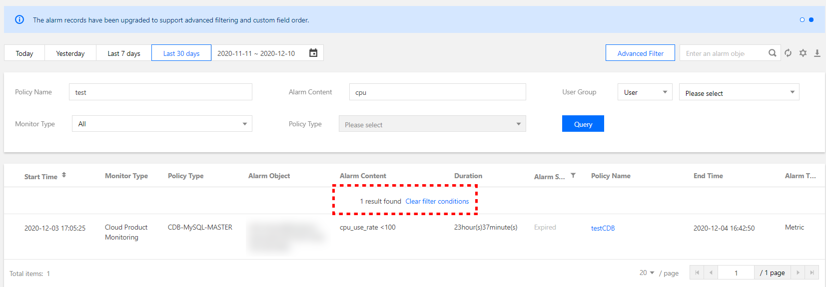 4. (可选)还可以单击高级筛选,根据策略名称、告警内容、用户信息、监控类型、策略类型搜索出符合条件的告警历史记录。
