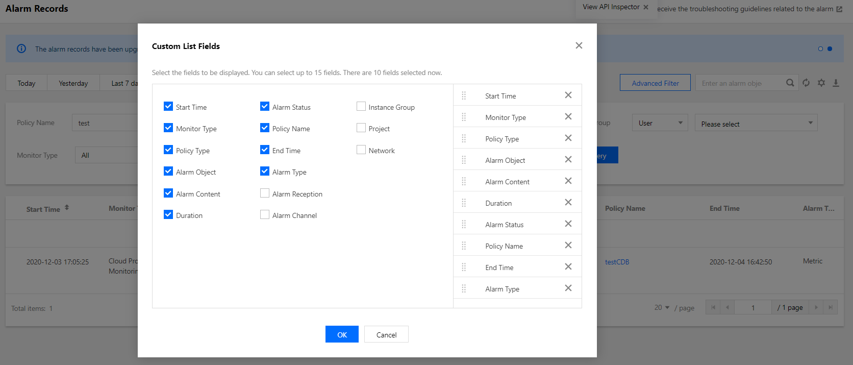 2. 单击右上角的。您可以在弹框左边勾选需要展示的字段,弹框右侧拖动字段名称调整字段排序,如下图。