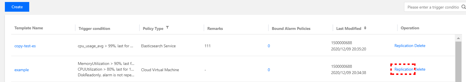 复制触发告警模板仅复制模板的触发条件规则,若复制的条件告警模板关联了告警策略,则不会复制其关联关系。