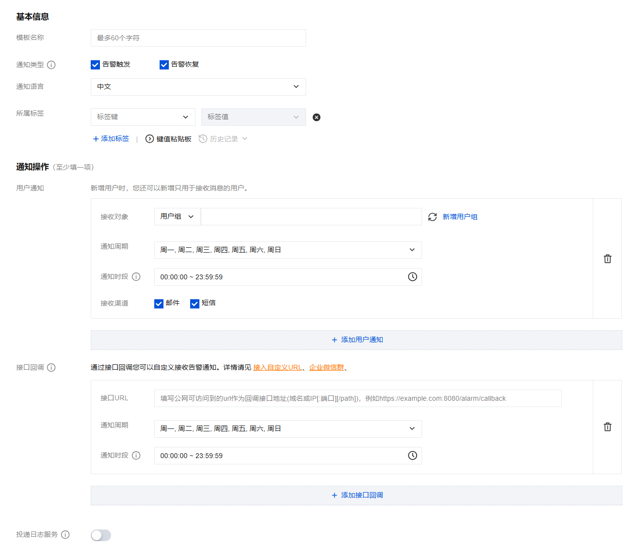 接收渠道:支持邮箱、短信、电话三种告警渠道。您还可以根据不同的用户维度,设置不同的告警接收渠道和通知时段,详情请参考 告警类型、渠道与配额。