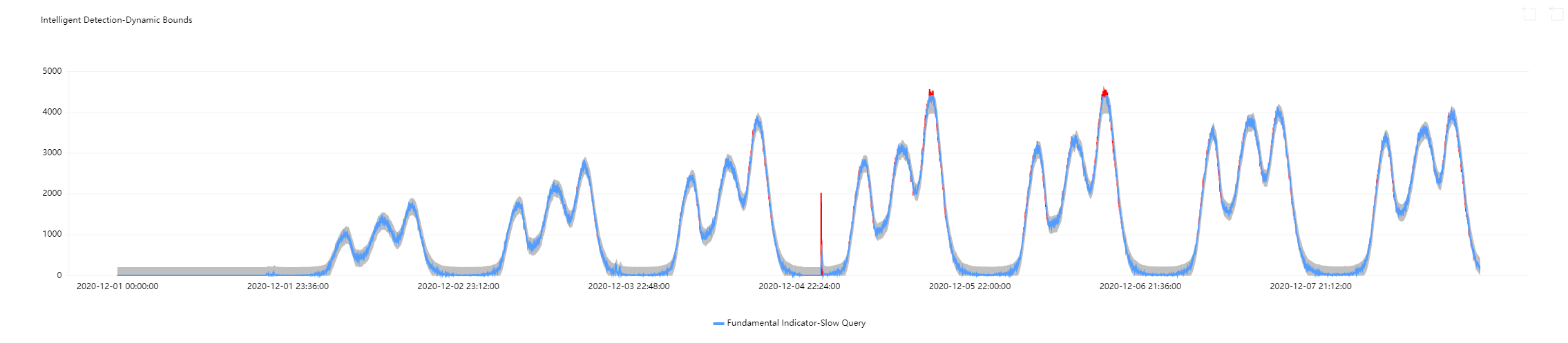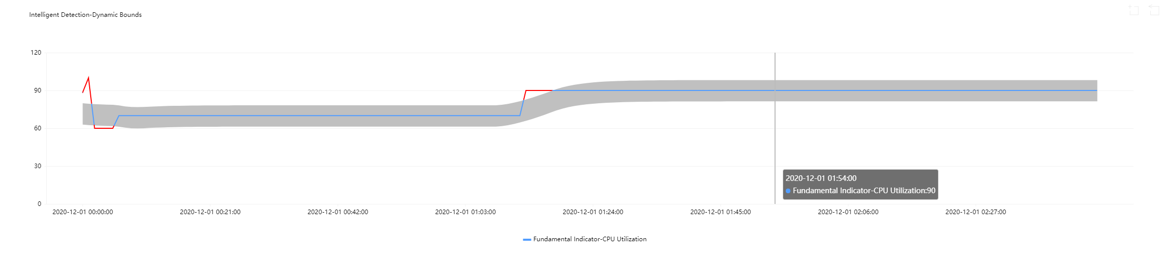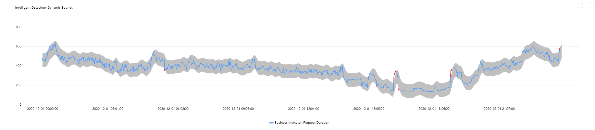 灰色阴影区域 :动态阈值计算出的合理范围,当指标在此区域内表示正常,超出区域外表示为异常。