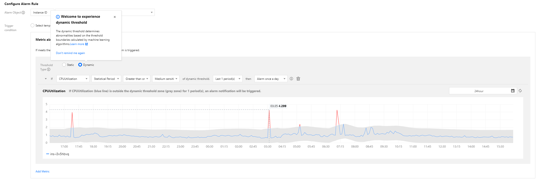 动态阈值的告警规则可以使用相同的告警规则,基于指标行为的上限和下限创建定制的阈值。 选项包括:
