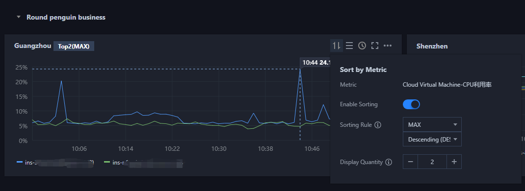 在图表分析时,您可以单击图表中【】,一键开启 TOPN 各图表的功能。调整排序规则、展示数量。方便您大批量查看机器高低负载。如下图仅展示帝企鹅业务—后端的 TOP2 实例: