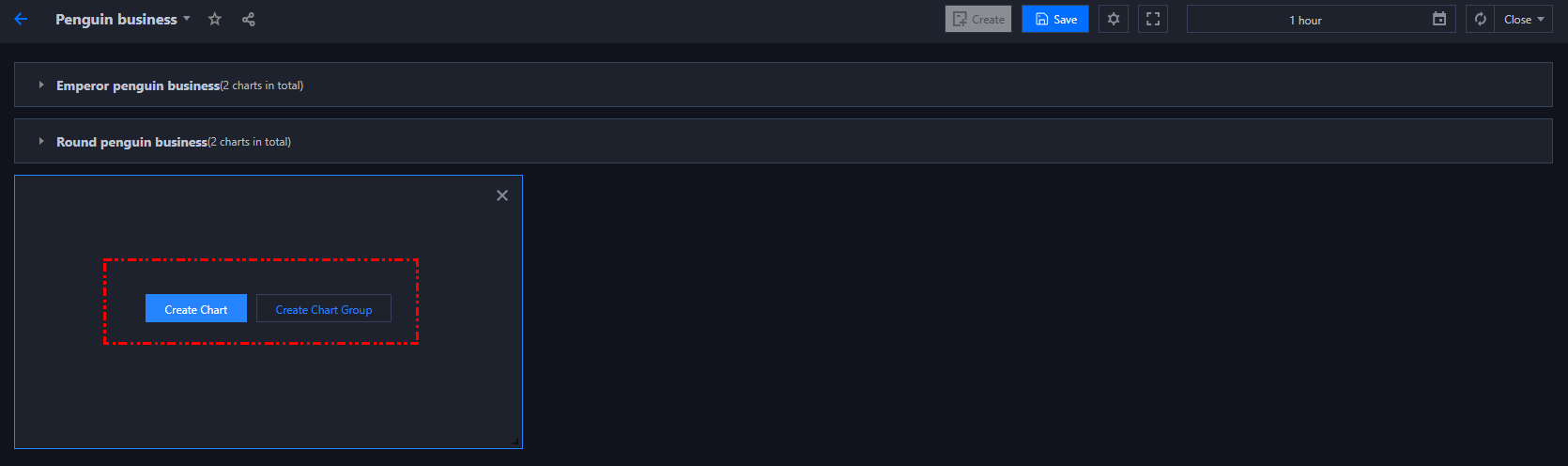 2. 新建图表组。如下图所示,单击 Dashboard 右上方的新建图标后,单击【新建图表组】输入图表组名称即可创建图表组,本文按业务分类创建2个图表组。