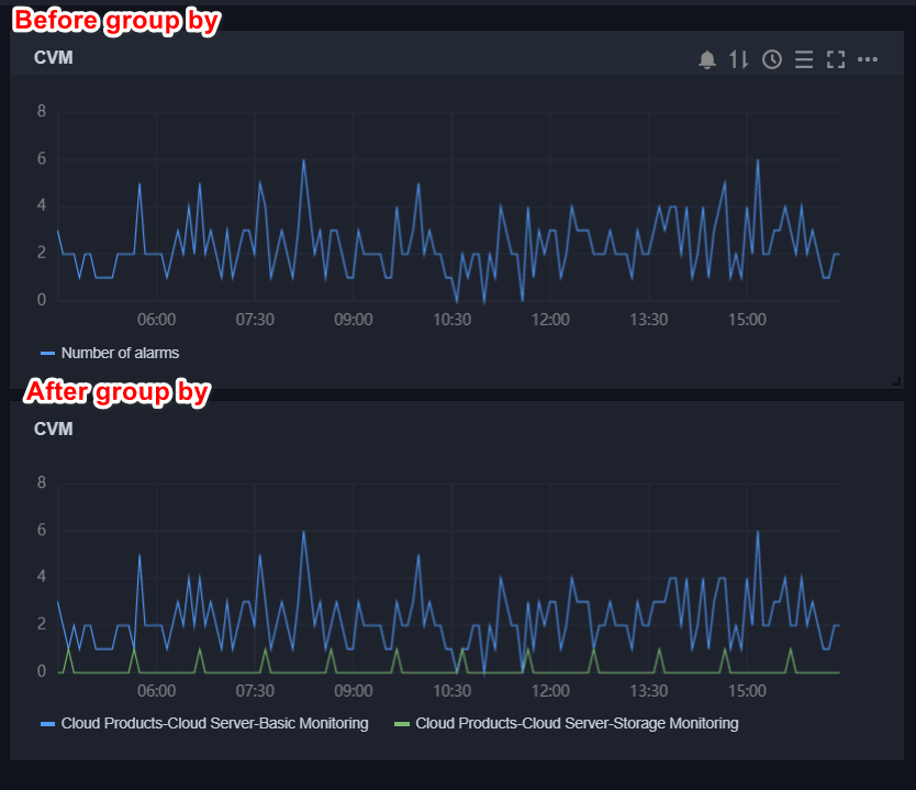 group by:类似 SQL 的 Group by 功能,根据云产品类型或自定义监控-命名空间进行分组后再按照聚合算法聚合。如下图: