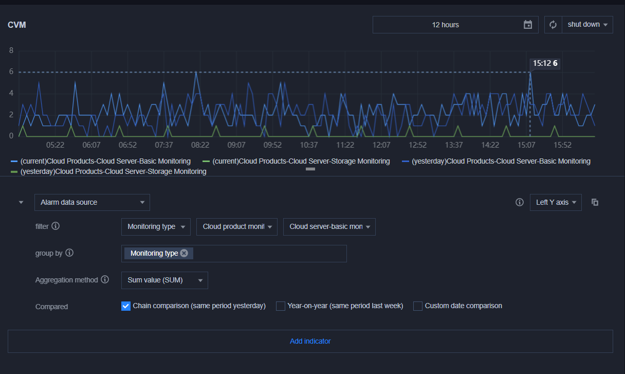 对比:支持环比(昨天同时段)、同比(上周同时段)和自定义时间对比。当您都勾选后,图表会出现所选实例昨天同时段监控曲线和上周同时段监控曲线,方便您进行数据对比。
