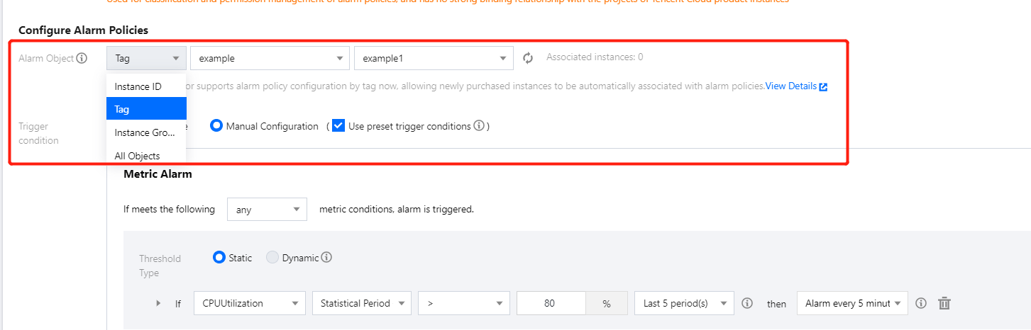 若告警对象绑定为“标签”类型,暂时无法切换到实例 ID、实例分组和全部项目的告警对象类型。如需切换告警对象类型,需重新创建告警策略。