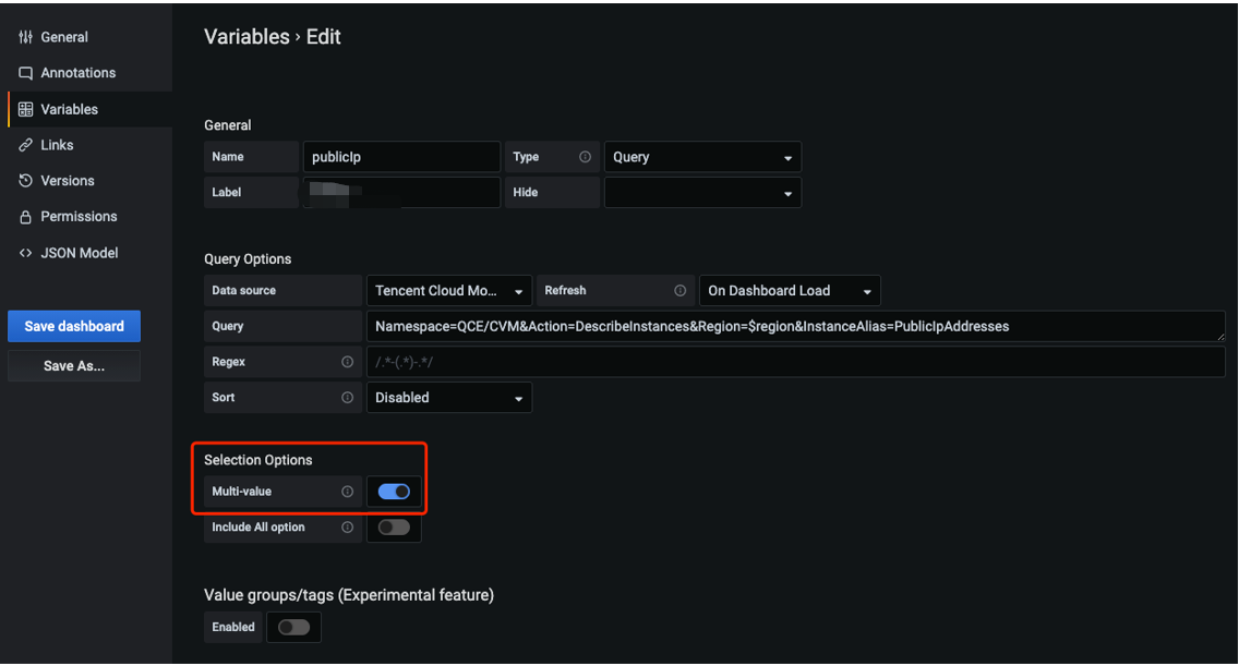 region 模板变量,则仅支持单地域查询。多地域实例对比可在同一个 Panel 中建多个 Query Target。Selection Options 下的 Multi-value 设置为 true。