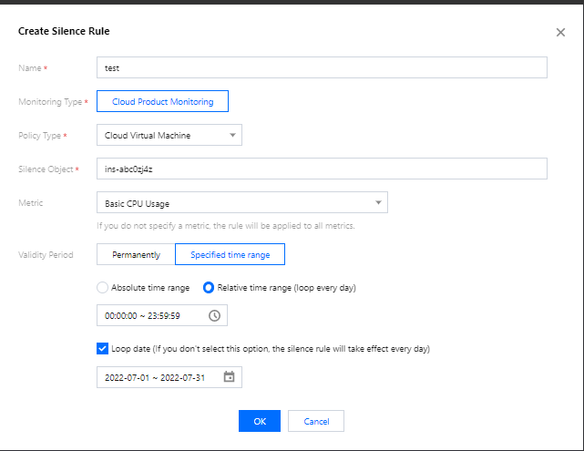 生效时间范围-指定时间范围 | 指定时间范围内告警屏蔽规则生效。 绝对时间范围:告警屏蔽规则仅在指定时间段内生效,您可以设置固定的生效时间范围。 相对时间范围(每天循环):告警屏蔽规则每天循环在固定时区内生效,您还可以设置循环日期范围,即从哪天到哪天循环生效。 例如您设定了循环日期为:2022年6月1日-2022年6月30日 ,生效时间为:10:00-11:00。则告警屏蔽规则将会在2022年6月1日-6月30日每天的10:00-11:00生效。 |