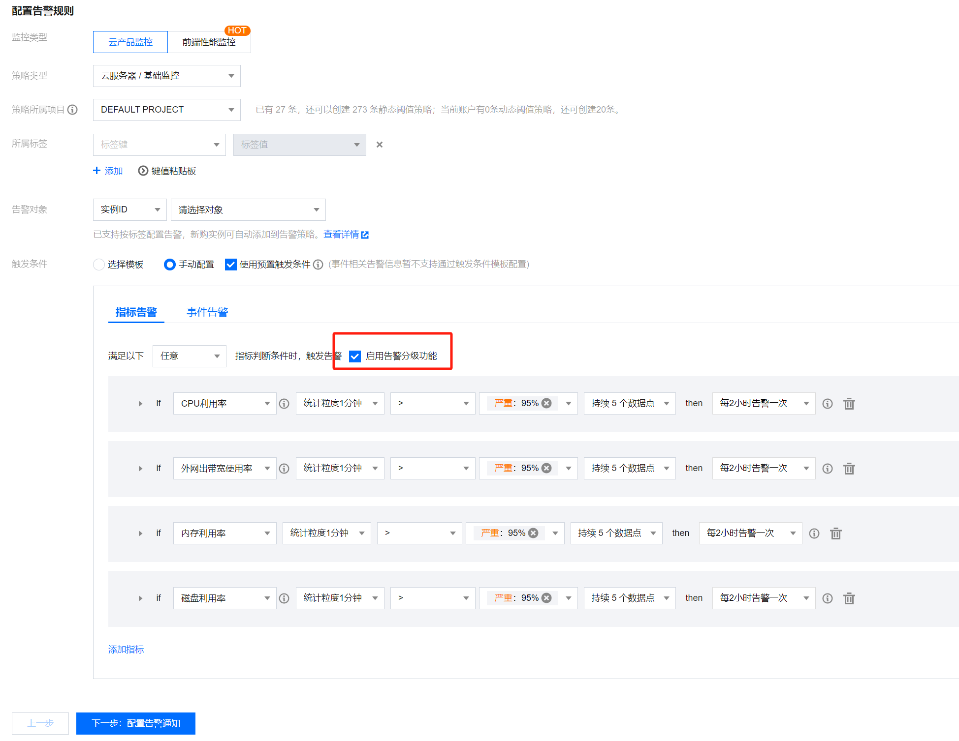 对于初次创建启用了告警分级的策略,腾讯云可观测平台将默认配置全部告警级别。