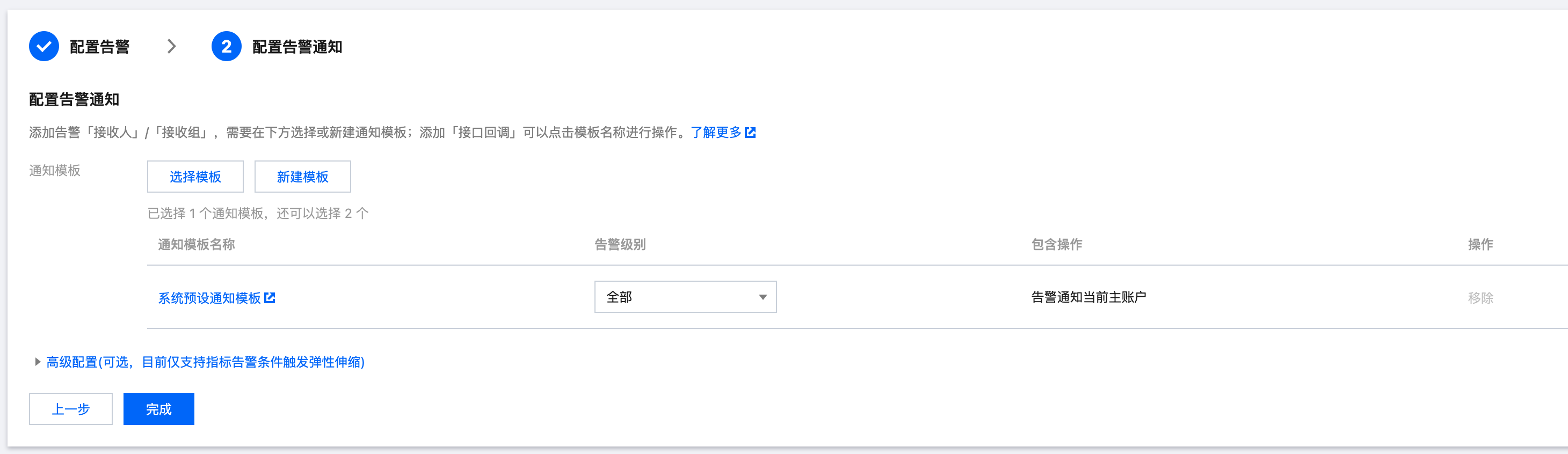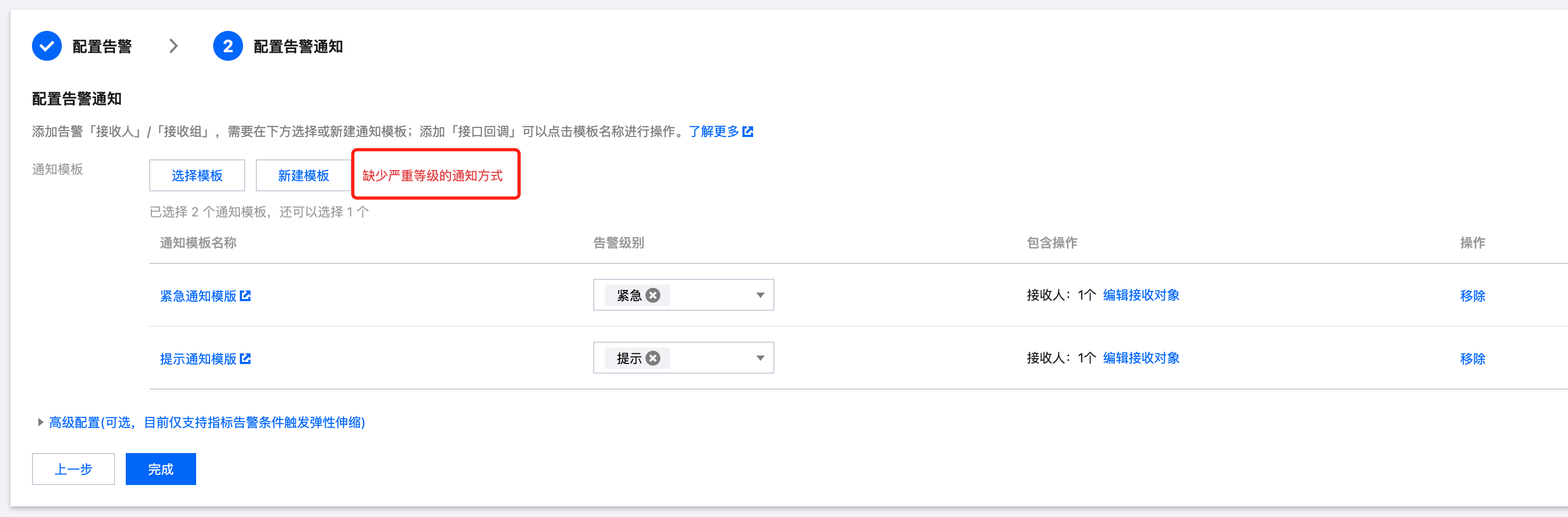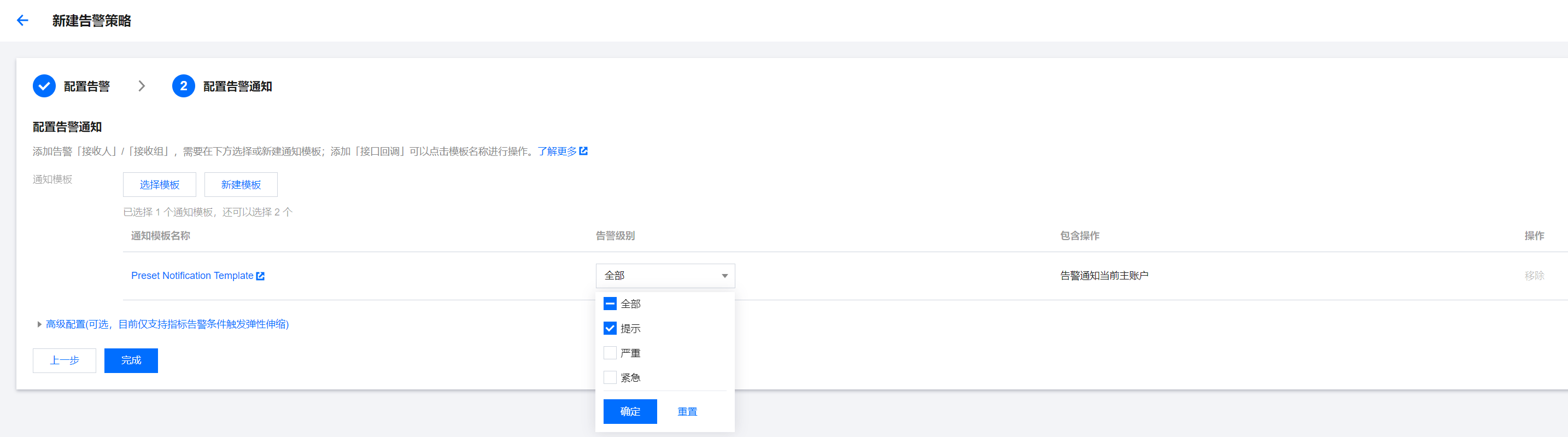 2. 点击新建策略完成基本信息和告警规则配置,并启用告警分级功能,然后单击下一步:配置告警通知。 3. 进入配置告警通知页面,根据告警级别配置不同的通知模板。一个告警模板支持配置一个或多个告警级别。 说明: