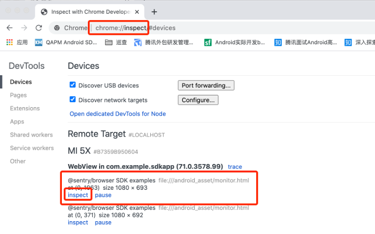 chrome://inspect,在出现的设备中单击 inspect。
