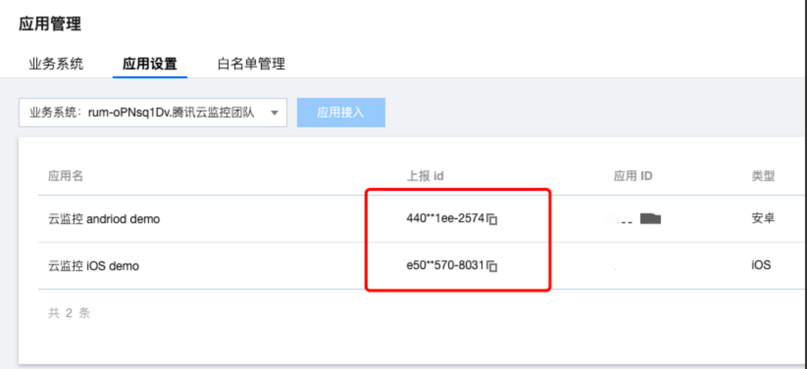 登录 腾讯云可观测控制台,在终端性能监控页面,选择应用管理 > 应用设置,进入应用设置后,获取 Appkey(上报 ID)。